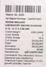 Natural Diamond CVD round shape brilliant mix cut 1 pcs. IGI – 5,09×5,12×3,13mm 0,50ct. (1306931664)