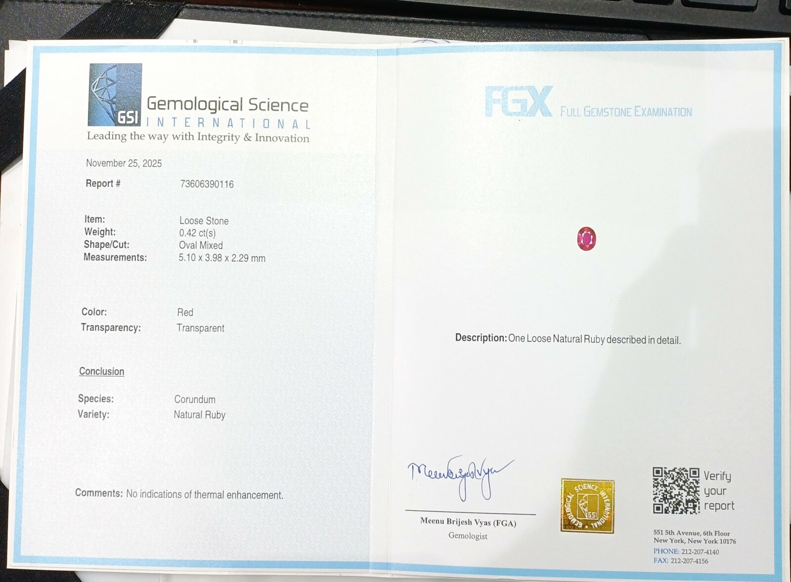 Natural Ruby oval shape Certificate GSI faceted mix cut 1 pcs.- 5,10×3,98×2,29mm 0,42ct. (80888)