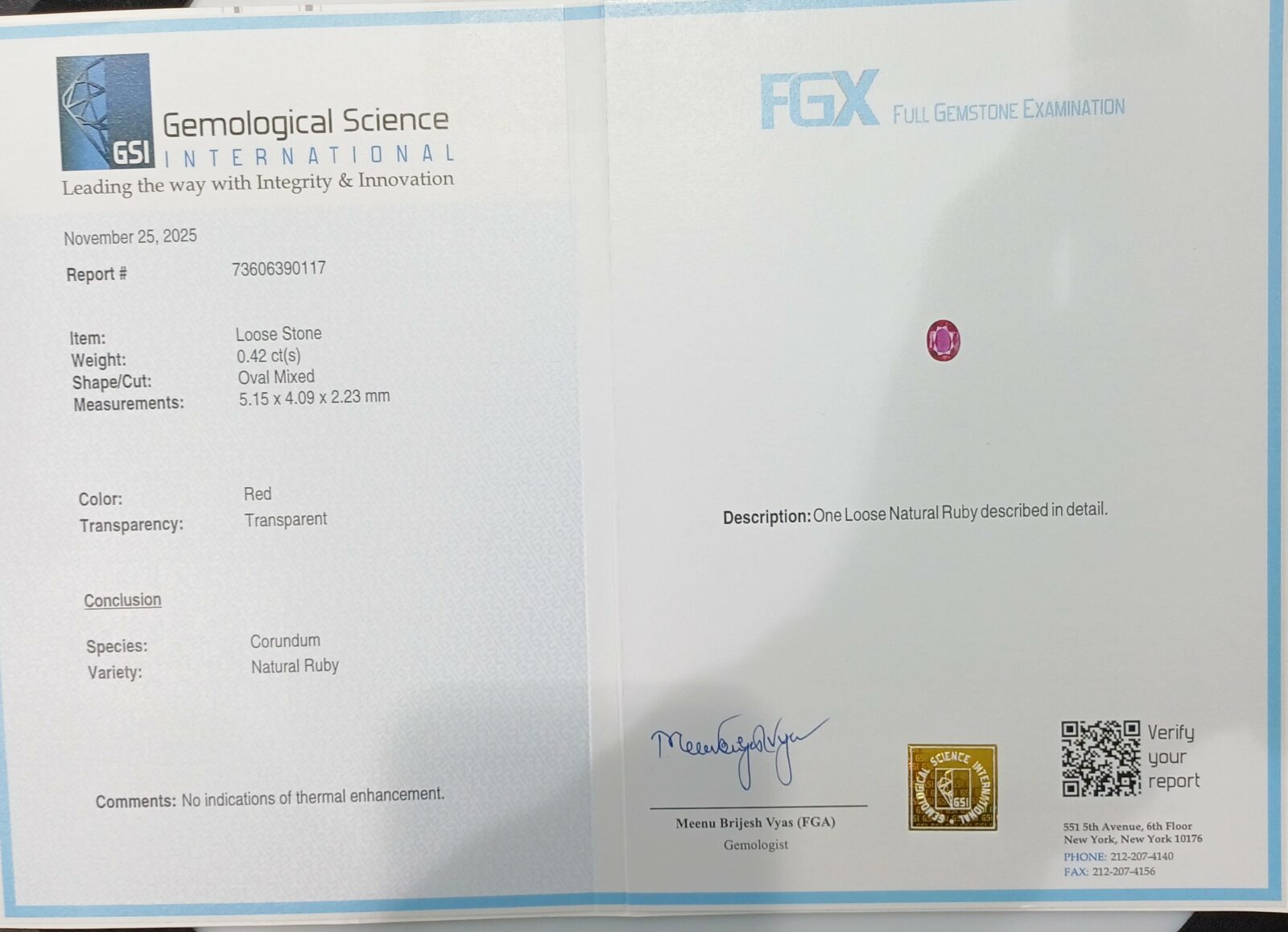 Natural Ruby oval shape Certificate GSI faceted mix cut 1 pcs.- 5,15×4,09×2,23mm 0,42ct. (80884)