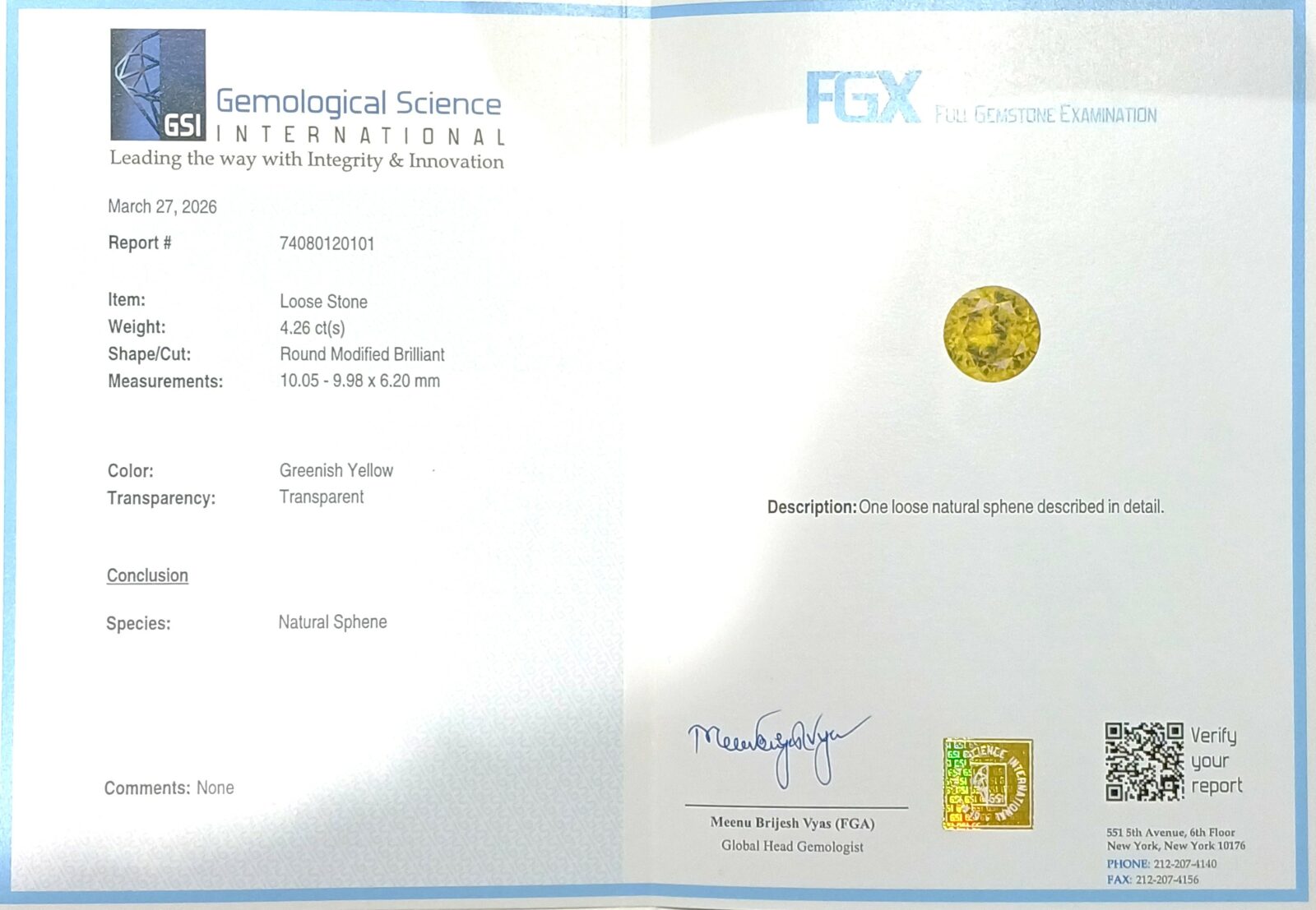 Home Sphene (Titanite) Natural Sphene (Titatite) Round Certificate GSI brilliant mix cut 1 pcs.- 10,05×9,98×6,20mm 4,26ct. (80945)