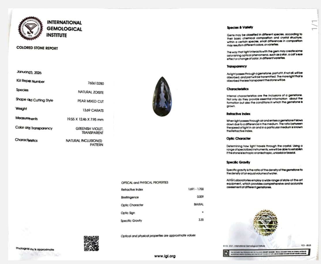 Natural Tanzanite unheated pear shape Certificate IGI step mix cut 1 pcs.- 19,55×12,46×7,95mm 13,69ct. (80361)